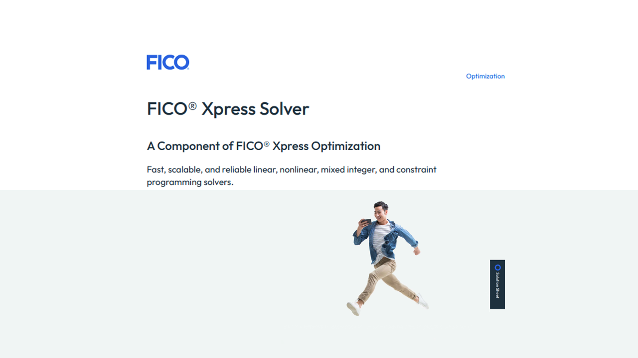 Xpress Solver solves linear, mixed integer, nonlinear, mixed integer nonlinear, and constraint programming problems at scale. Built for speed, robustness, and flexibility, Xpress Solver offers advanced presolve techniques, cutting planes, parallel processing, and sophisticated heuristics to deliver fast, reliable solutions across a wide range of industries and use cases. Whether optimizing supply chains, pricing, resource allocation, scheduling, or strategic planning, Xpress Solver is designed to handle models of any size or complexity—from small tactical decisions to commercial-sized problems involving millions of variables and constraints.